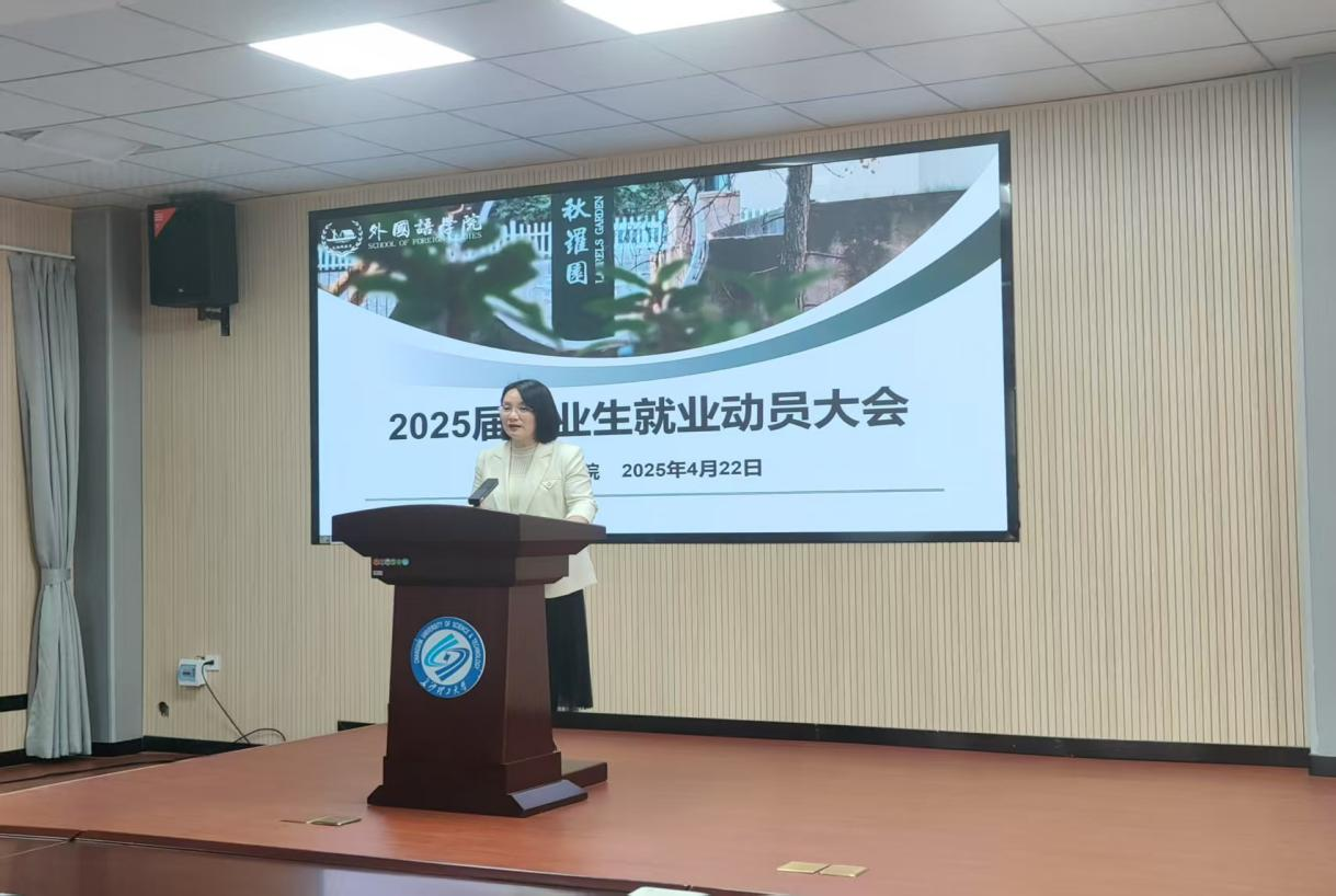 2025年4月22日上午11点,外国语学院在3教321报告厅召开了毕业生动员大会。本次动员大会由学院党委副书记周芳主讲,旨在帮助毕业生分析就业形势,鼓励毕业生以积极的心态进行求职和择业。