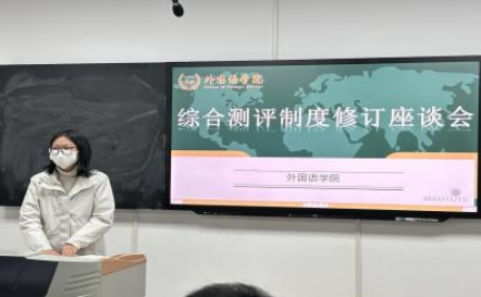 2023年11月15日晚,为进一步完善综合测评制度,外国语学院于金盆岭校区3号教学楼611教室组织召开综合测评制度修订座谈会,参会人员有党委副书记周芳老师、陈若晨老师、毛婕老师及各班班长和团支书,由毛婕老师主持会议。