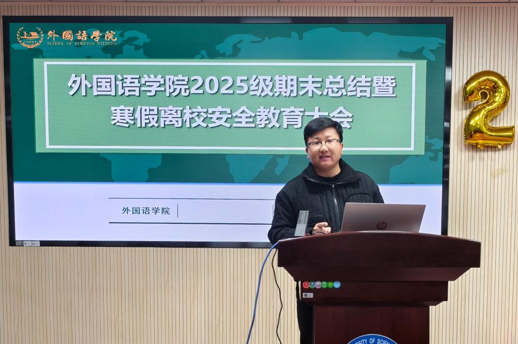 寒假将至,为做好2025级本科生期末总结,帮助学生全面了解英语行业现状,切实增强学生的风险防范意识和避险能力,提升同学们在寒假期间的安全意识,保障学生人身和财产安全。1月19日下午,外国语学院2025级本科生期末总结暨寒假离校安全教育大会在金盆岭校区3教321报告厅顺利召开。外国语学院党委书记陈仁凯、2025级年级辅导员郭恒及全体本科新生参加了本次大会。