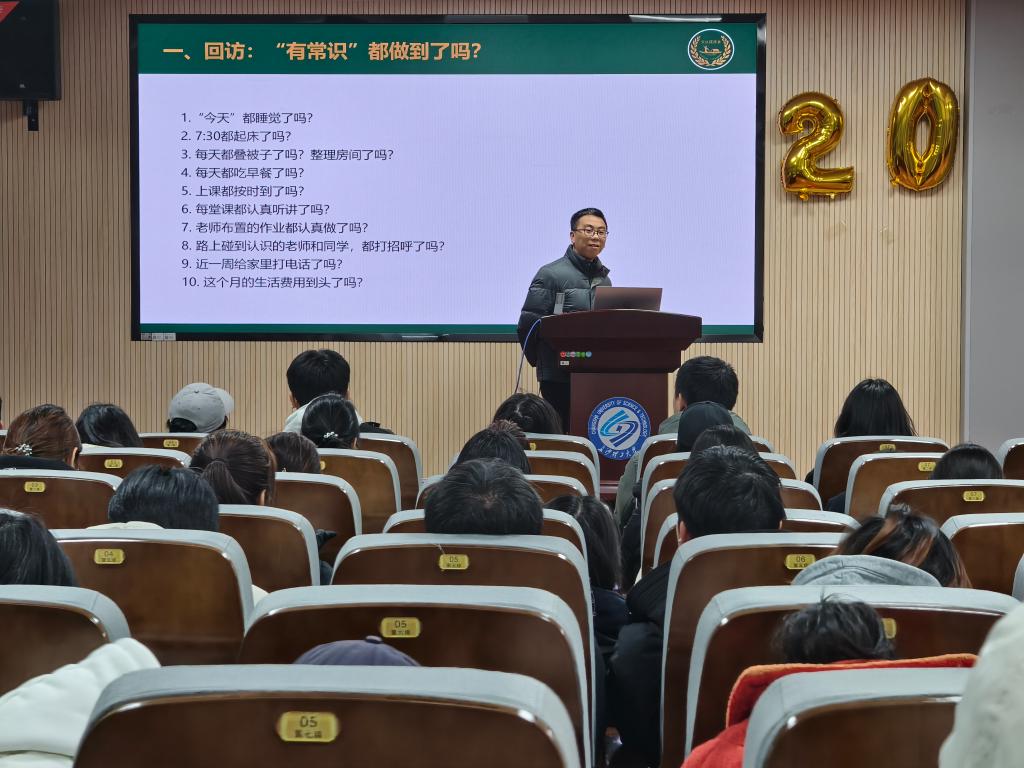 会议伊始,年级辅导员郭恒老师首先对本学期的年级工作进行了全面总结。他围绕学风建设与养成教育两大主题,详细介绍了新生适应性教育、早晚自习制度执行、专业学习引导等方面取得的成效,肯定了同学们在大学生活初步探索中展现的积极面貌。随后,就寒假放假时间、离校登记手续、返校报到安排、寒假任务等事宜进行了清晰部署,并重点开展了寒假安全教育。他结合典型案例,从交通安全、防电信诈骗、消防安全、心理健康、饮食安全等多个维度进行了细致讲解,叮嘱同学们牢固树立“安全第一”意识,确保度过一个平安、健康、充实的假期。
