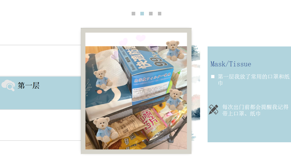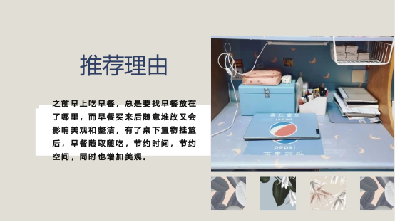 英语2101班的李梓僮同学说:“此次宿舍收纳大赛,我展示了我自己推荐的收纳好物,同时,我也学到了很多实用的收纳技巧和方法,有助于寝室环境的干净整洁,在有限的空间里,迸发出无限的创意。”
