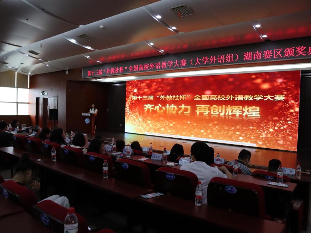 “外教社杯”全国高校外语教学大赛始创于2010年,是我国最早举办的全国性外语类教学大赛。大赛由教育部高等学校外国语言文学类专业教学指导委员会、教育部高等学校大学外语教学指导委员会、教育部职业院校外语类专业教学指导委员会和上海外语教育出版社主办。大赛覆盖全国千余所高校,因其严谨、创新、公正、权威,获得了外语界一致的赞誉和教育主管部门的高度评价,在中国高等教育学会发布的“全国普通高校教师教学竞赛分析报告”中位列外语类教学大赛首位。本次大赛由湖南省普通高校外国语言文学类专业教学指导委员会主办,湖南省高教学会大学外语专业委员会、日语专业委员会协办,云顶国际vip8866外国语学院联合上海外语教育出版社承办。