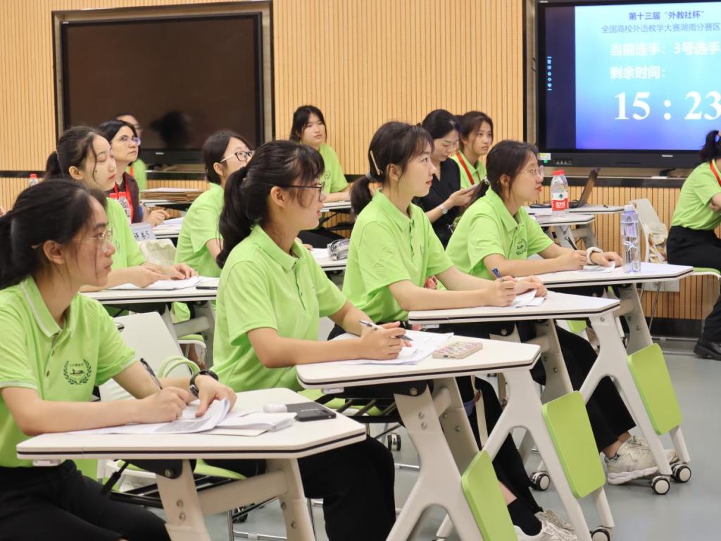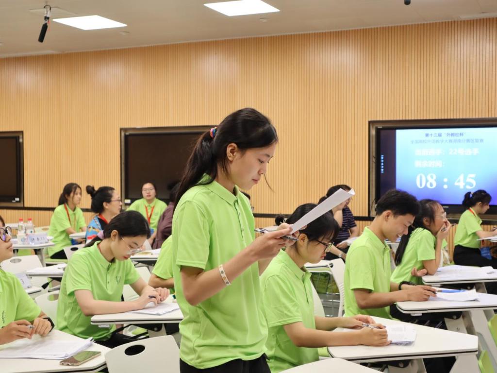 “我们赛场的学生都好可爱,特别配合我,学生的综合素质很高,全程下来都挺顺利的,希望能取得一个好成绩!”刚从综合教学楼C区304大学英语综合课组比赛出来的选手章珩跟旁边的选手感慨道。2022年6月18日至19日,第十三届“外教社杯”全国高校外语教学大赛(大学外语组)湖南赛区复决赛暨颁奖典礼在云顶国际vip8866成功举行。来自湖南省内30所高校的61名专业选手们分别参加到大学英语综合课组、大学英语(视)听说课组、大学日语组三个组别的比赛角逐中。