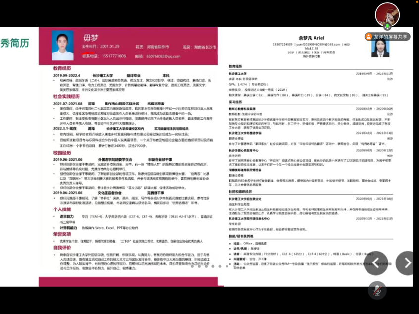 龙洋从就业信息搜索与管理的方法、求职相关事项、简历制作给学生进行了分享。她给学生分享了搜找就业信息的各类平台,也重点就“云顶国际vip8866云就业平台”微信公众号的具体使用指南给学生进行了指导。她通过展示一些本年级学生的优秀简历,指导学生如何制作一份令面试官满意简历,如何捕获面试官的心。此外,她还重点分享了基层就业的形式与鼓励政策,并教授了一些面试的技巧及求职需要注意的细节。