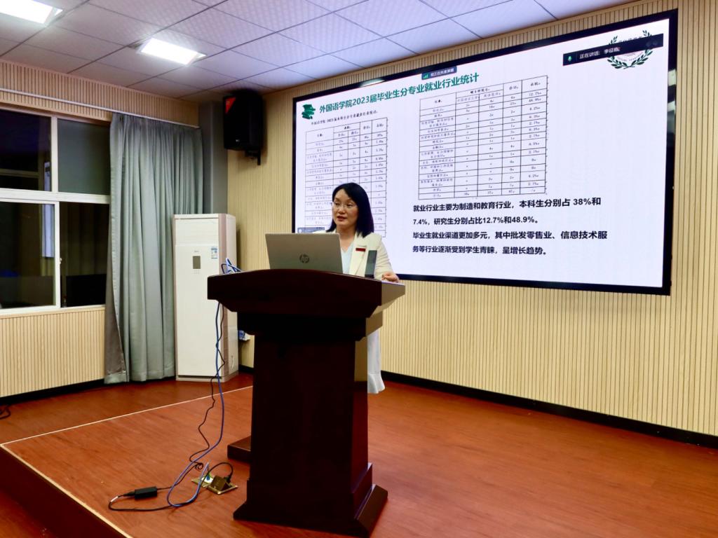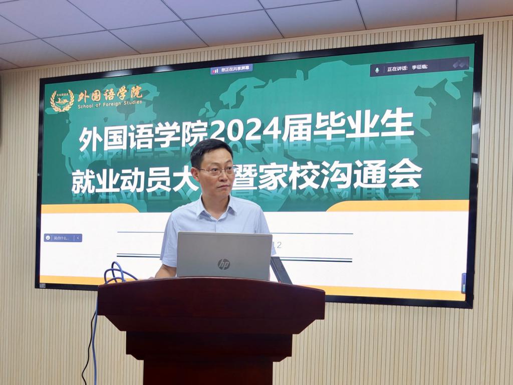 为及早谋划2024届毕业生就业工作,动员学生做好就业准备、形成家校合力工作局面,外国语学院于9月12日召开2024届毕业生就业动员大会暨家校沟通会。学院党委书记文丽丽、院长段胜峰、党委副书记周芳出席,全体2024届毕业生线下参会,毕业生家长线上参加。会议由学工办主任、就业专干武巧琳主持。