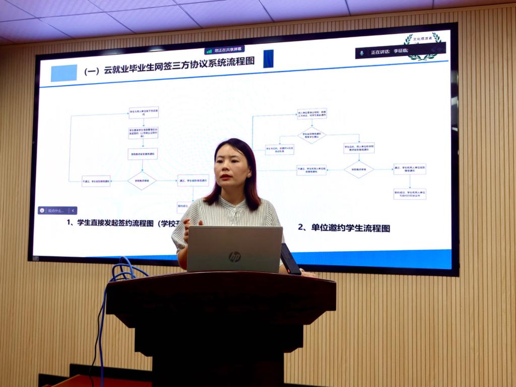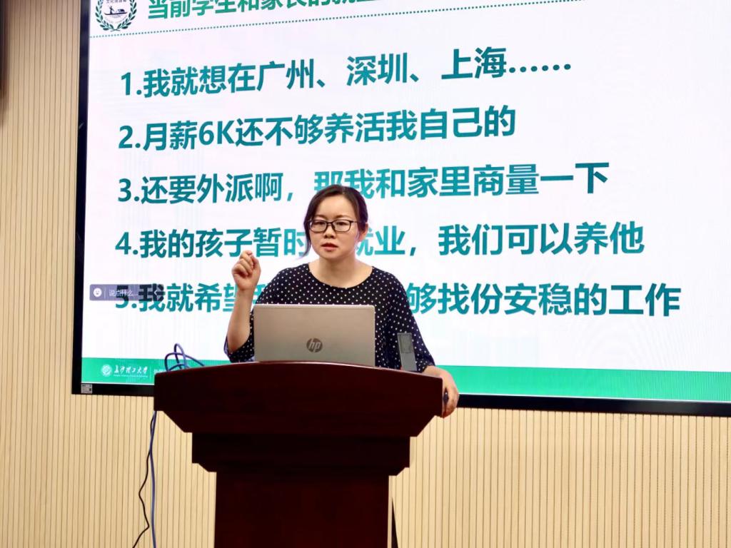 武巧琳作就业工作具体指导,她从就业平台操作指南、学生常用操作、必知就业知识三个方面展开,详细深入地向同学们介绍了签约、信息查询、求职基本材料准备等求职过程中的重点内容。