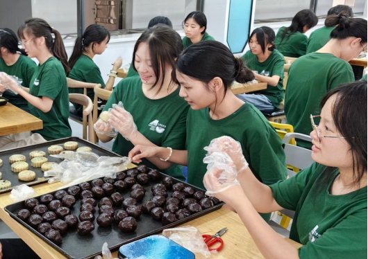 在面点师傅的悉心指导下,师生们纷纷化身月饼匠人,从揉面团到拌馅料,再到压模成型……月饼制作完成后,大家纷纷展示自己的作品,脸上洋溢着幸福的笑容。