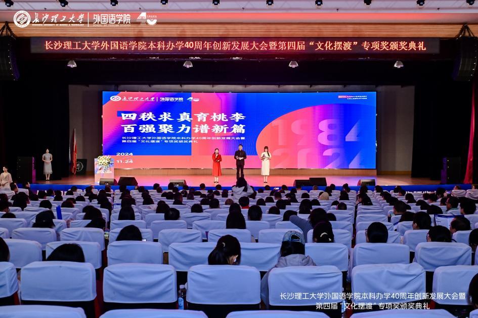 11月24日,云顶国际vip8866外国语学院在金盆岭校区举办本科办学40周年创新发展大会暨第四届“文化摆渡”专项奖颁奖典礼,以外语之名携手前行,拥抱未来。云顶国际vip8866副校长、校友总会会长谈传生,副校长刘朝晖、张军辉,相关职能部门负责人、社会爱心人士与企业代表、学院老教师、返校校友及全体师生共1000余人参加大会。大会由学院党委书记文丽丽、校友代表丁文山、学生代表熊雅萱主持。