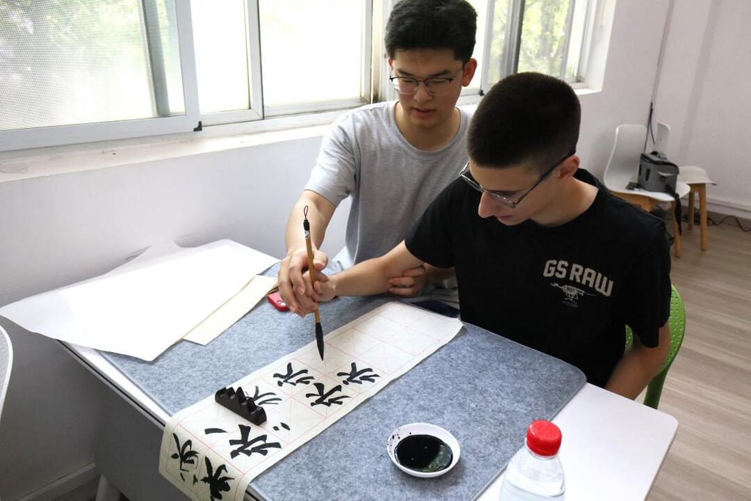 古琴课上,教师王继贤轻抚琴弦,奏响经典曲目《沧海一声笑》,志愿者黄蕾同步用英语解读“伯牙鼓琴遇知音”的典故。在老师指导下,营员们的指尖在琴弦“徽位”间跃动。练习“勾挑”指法时,营员吴晶惠兴奋地说:“太有意思了!我能在这里练上一整天!”