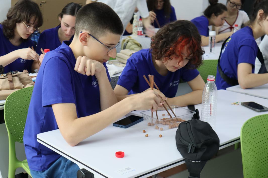 教师雷英在《食在长沙》课堂上铺开“八大菜系风味地图”,用分子料理模型解构川菜香气密码,借非遗视频揭开闽菜工艺奥秘。她手持商朝青铜箸复制品,将“银筷验毒”传说与“天圆地方”哲学巧妙串联,并现场演示筷子使用礼仪。“30秒夹花生挑战赛”中,营员们全情投入,获胜者获赠湘妃竹筷——这份独具中国韵味的礼物,既是对胜利的嘉奖,更是文化友谊的见证。