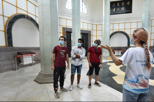在烈士公园的展览墙上,记载着革命先辈们的生平事迹,翻译团成员们认真观看,追寻属于革命先辈们的红色记忆,并向外国友人讲述先辈们的光辉故事。
