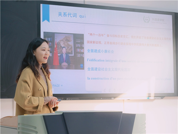 比赛中,来自学院各系(教研室)英语、法语、西班牙等语种的6位青年教师通过精彩的课堂教学,展现了他们对语言教学的深刻理解。法语教师王艺重点讲授了法语定语从句的使用,语法讲解透彻,表达清晰。西班牙语教师裴冉以中国和西班牙传统节日为主题,引导学生在具体情境中积累相关词汇及语法表达,在此基础上思考中西文化的异同,提升学生跨文化交际能力和思辨能力。英语教师徐青充分利用视听资源、小组合作等多种形式积极调动学生参与到课堂活动中,教学设计循序渐进、环环相扣,富有吸引力。其他教师也通过不同的教学内容、多样的教学方法展现了各自的课堂风采。