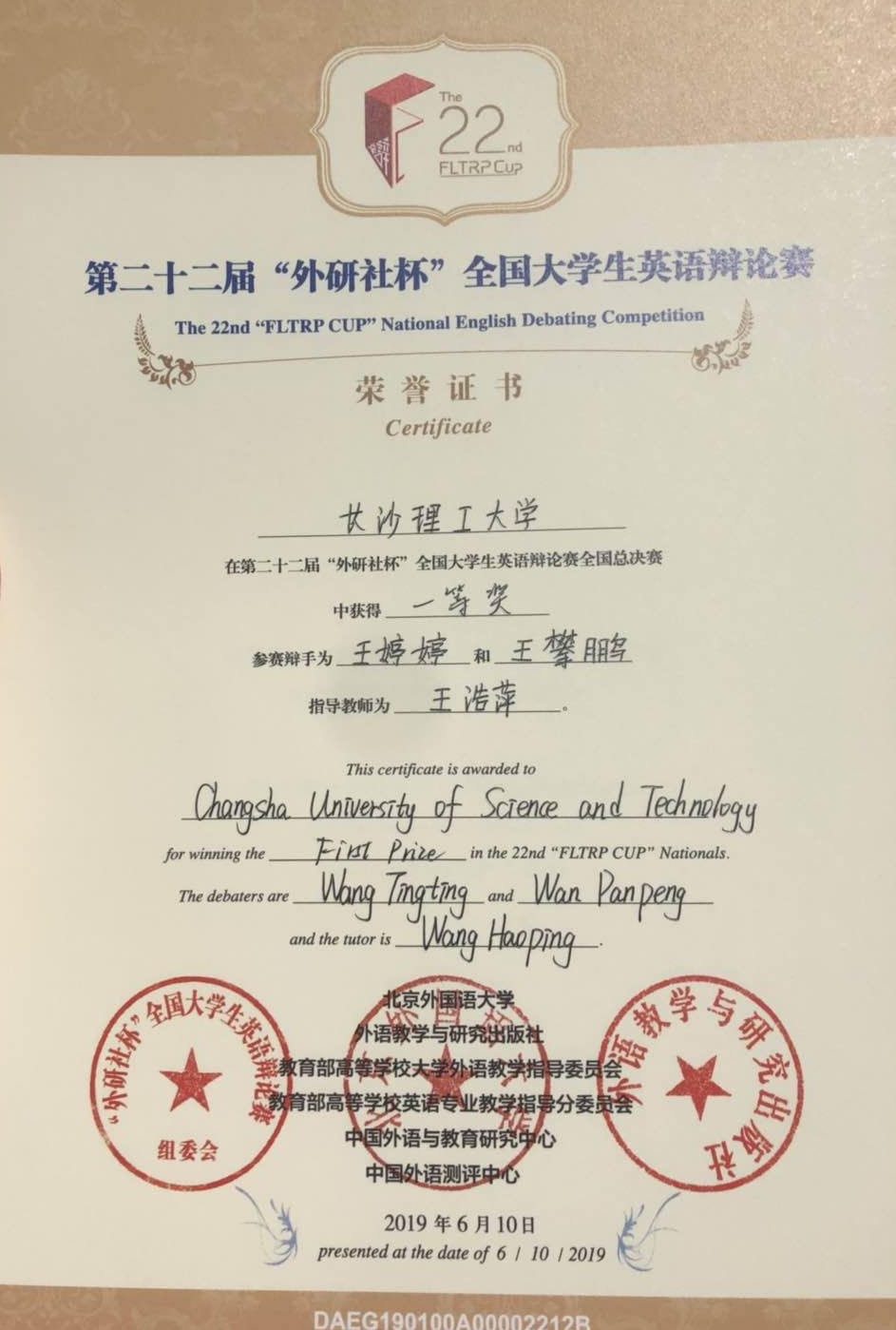 外国语学院16级英语专业王婷婷和17级翻译专业王攀鹏同学组成代表队参加比赛,外国语学院王浩萍老师担任指导老师兼领队。经过八轮循环赛、八分之一决赛和四分之一决赛的对决,云顶国际vip8866代表队凭借良好的逻辑思维能力、口头表达能力和临场应变能力,最终夺得大赛一等奖。