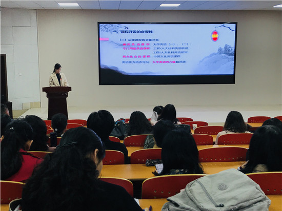 会上,本次主讲老师韩娜娜、涂帅首先简明扼要地介绍其拟开设的选修课《中国文化英语视听说》和《通用艺术英语视听说》,两位老师从课程开设的必要性、目标定位、师资团队建设、教材选用及建设、考核评估方式以及前期准备工作等方面展开详细论证。