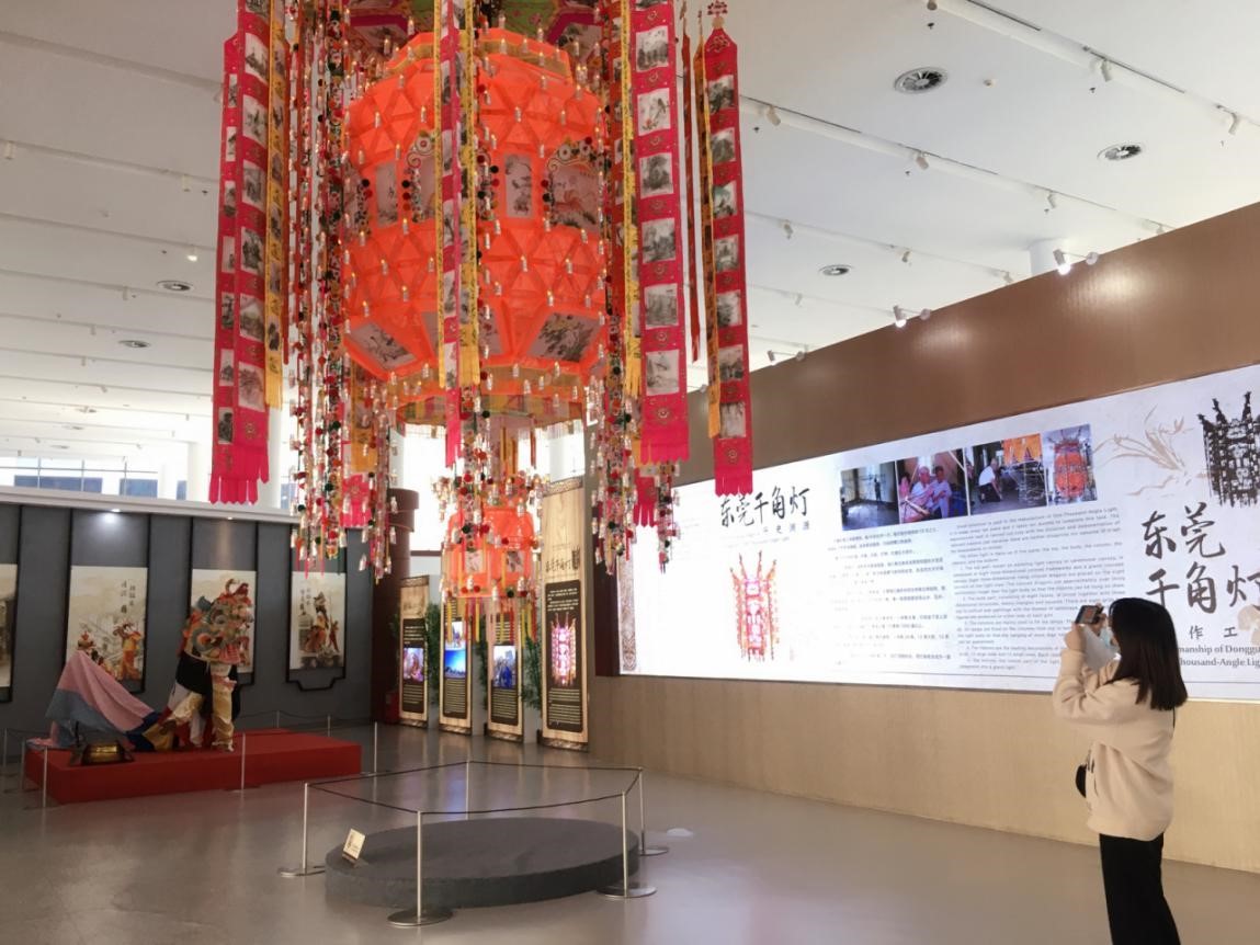 东莞非物质文化遗产展示厅,是在东莞市委、市政府的大力促进下打造的东莞非遗文化保护与发展的全新平台。展厅共由九个部分组成,分别为序厅、国家级非遗项目展示厅、莞味区、莞香区、莞风区、传习室、莞韵区、莞音区、后厅。作为东莞对外开放与交流的窗口,非遗展厅将成为集旅游、非遗知识普及、非遗产品研发、非遗理论研究为一体的重要场所和交流基地。沿着展厅参观,从镇厅之宝千角灯到素有“植物钻石”之称的莞香,再到高高翘起、气宇轩昂的“大头龙”……,她被工匠的精湛技艺所深深吸引。通过本次活动,她了解文化传承背后许多有趣的故事,真切感受到非遗文化的魅力,以及代表性传承人对艺术品质的专注与执着。