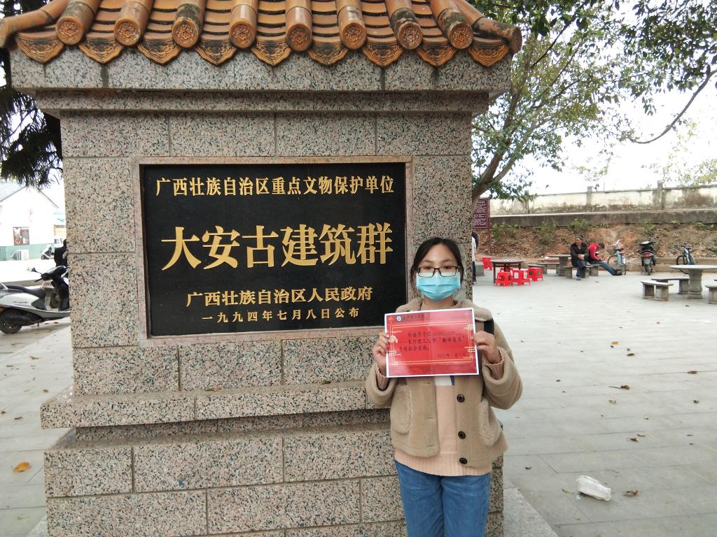 2021年1月28日,为提高翻译实践能力,外国语学院学生苏凤宜来到大安镇,通过参观大安古建筑群,进行了翻译实践活动。