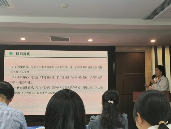 我院翻译专业研究生李罗亦青、潘越、谭静、李燕妮等同学在青年英才论坛及专题分组研讨等环节踊跃发言。她们结合自身的学习和研究经历,分享了主题为“《道德经》中自然主义话语英译传播的共生特征考察”与“现象学意向性理论视域下翻译动态性研究”等学术论文,展示了我院学子的科研能力和风采,得到了与会专家的肯定。