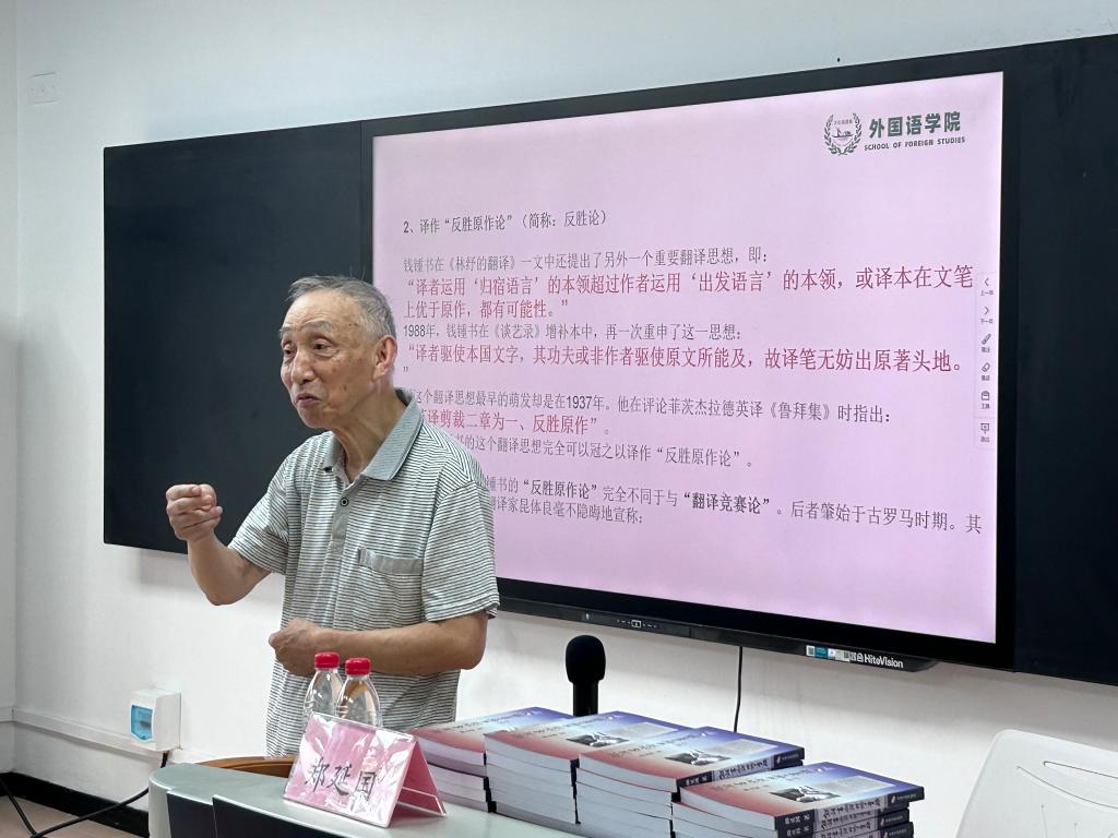 “从事教书育人和关心下一代工作是我的毕生志愿,此次能够为新生上开学第一课我感到非常高兴,希望能让更多学生通过我的课堂感受到翻译的魅力与精髓,帮助更多人学好翻译。”9月19日下午15:00,78岁的银发老人郑延国教授在云顶国际vip8866金盆岭校区3教416多媒体教室给全体23级研究生新生开展云影讲坛讲座,讲授入学教育第一堂学术课——钱钟书学术思想和翻译两论。