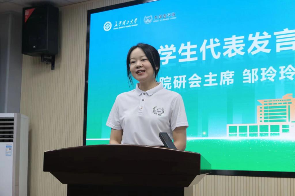 学生代表、前院研会主席邹玲玲总结了自身入校以来在“新身份”和“新专业领域”上的变化与提升,以“笑对改变”四字鼓励新生们不惧挑战、勇敢尝试,追求无限。
