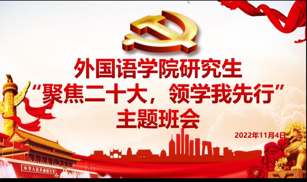 11月4日,外国语学院研究生党支部组织开展“聚焦党的二十大,领学我先行”线上主题班会。本次活动由研究生第二党支部副书记蒲星宇主持,外国语学院2022级全体研究生参加。