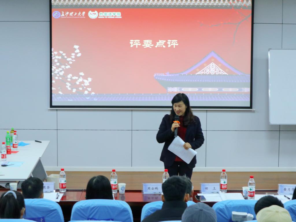 外国语学院钟桂蓉老师对参赛选手的表现进行总结点评。钟老师肯定各位选手的课堂表现力,对选手们丰富的知识储备和专业的授课技能提出表扬并对此次对外汉语大赛在其他学院的“流行”表示欣慰。钟老师同时提出建议,希望各位对外汉语教师能够在疫情的大背景下更进一步去思考如何将线上教育与对外汉语教育相融合,实现进一步传播中华文化这个最终目的。