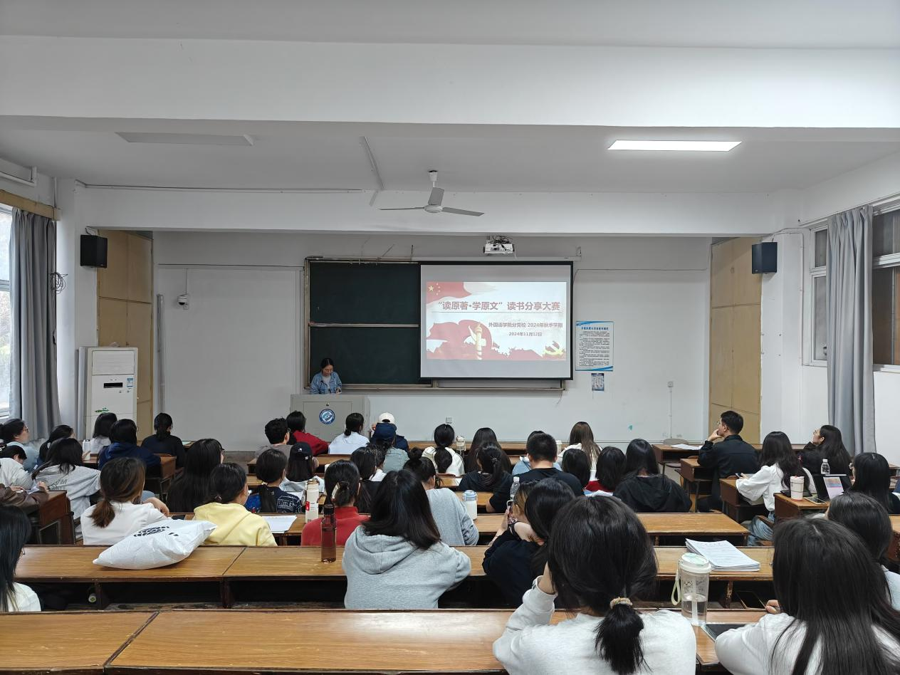 11月12日下午,外国语学院分党校于金盆岭校区3教218开展“读原著·学原文”读书分享大赛,本次比赛由研究生第一党支部党员龙晴云主持,外国语学院分党校第44期入党积极分子培训班、第21期发展对象培训班以及第30期预备党员培训班全体学员参加。