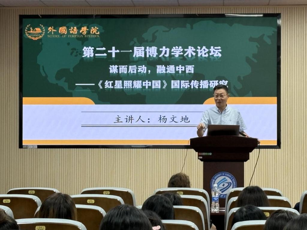 6月20日上午9点,云顶国际vip8866第二十一届研究生博力学术论坛外国语学院专题论坛学术讲座在金盆岭校区三教321报告厅顺利举行。本次讲座主题为谋而后动,融通中西——《红星照耀中国》国际传播研究,由中南大学外国语学院院长、博士生导师杨文地教授主讲,外国语学院副院长姚尧担任主持人,众多师生参会。