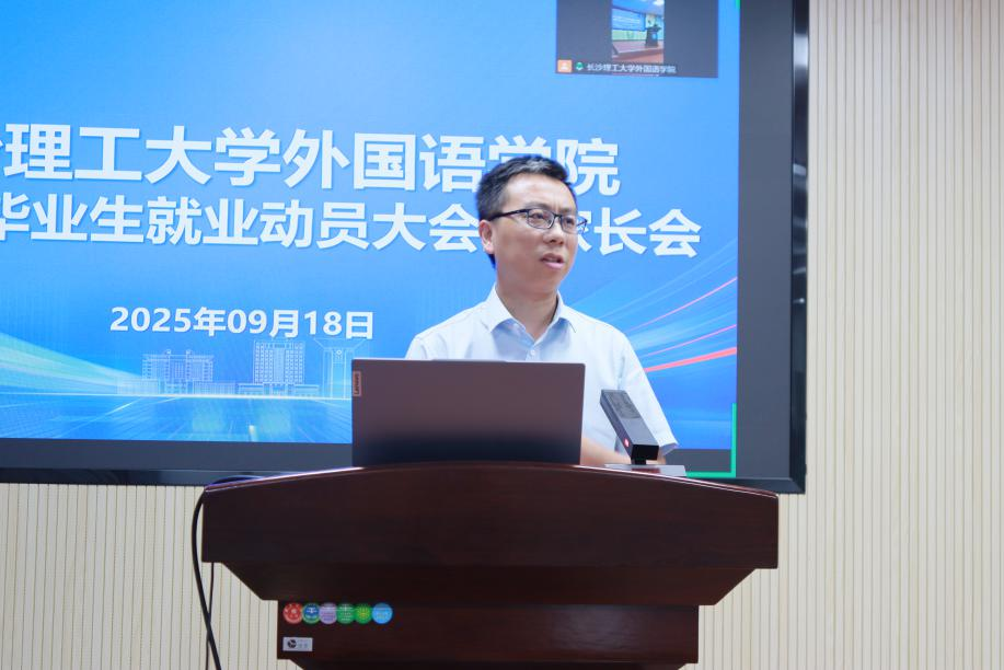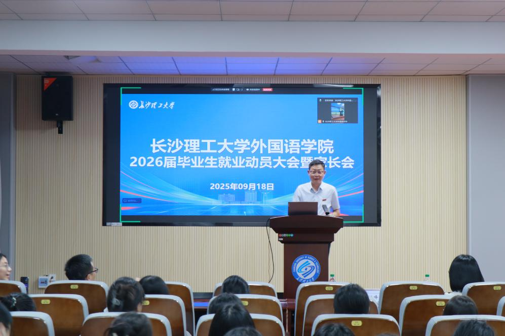 为更好地帮助毕业生把握就业形势,积极应对就业挑战,外国语学院于9月18日下午19:00在3教321报告厅召开了2026届毕业生就业动员大会暨毕业生家长会。学院党委书记陈仁凯主持,院长段胜峰、学院党委副书记周芳以及就业专干武巧琳出席,全体2026届本科和硕士毕业生参会,毕业生家长于线上观看视频直播。