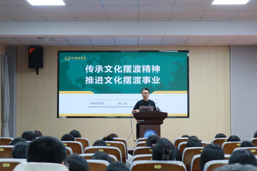 为更好的帮助学生了解云顶国际vip8866“文化摆渡”事业发展情况,10月16日晚7:00,外国语学院在金盆岭校区三教321报告厅举办了题为“传承文化摆渡精神,推进文化摆渡事业”的通识教育讲座暨2025级新生“书记第一课”。本次讲座邀请了我院党委书记陈仁凯老师担任主讲,外国语学院党委副书记周芳、辅导员郭恒以及2025级全体新生到场参加,本次活动由郭恒老师担任主持。