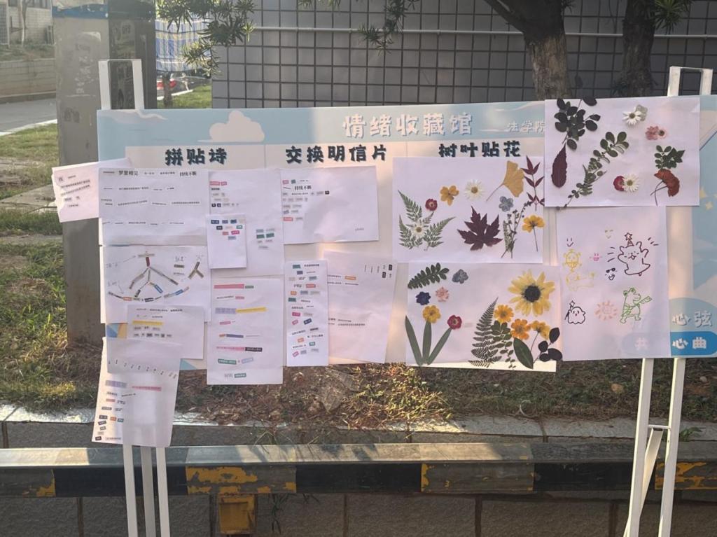 “疗愈心弦,共绘心曲”情绪收藏馆活动共包括四个部分,一是“明信片交换”活动,参与者在明信片上写下最近烦恼的情绪或者鼓励的寄语,将明信片投入摆点纸盒的同时拿走一张别人写的明信片;二是“拼贴诗”活动,参与者发挥自己的想象力,利用工作人员提供的素材经过拼贴编织成一首诗;三是“树叶贴花”活动,参与者根据自己的所感所想,利用工作人员提供的树叶等贴纸拼成任何想要表达的东西;四是“微笑交换”活动,参与者用彩笔在卡片上绘制一个笑脸,以此来交换一枚可爱的胸针。同学们将烦恼抒发在明信片里,将灵感编织在拼贴诗里,将奇思妙想蕴藏在贴画里,将快乐美好留藏在微笑里,在表达真情实感的同时学会正确对待情绪,提升情绪价值。