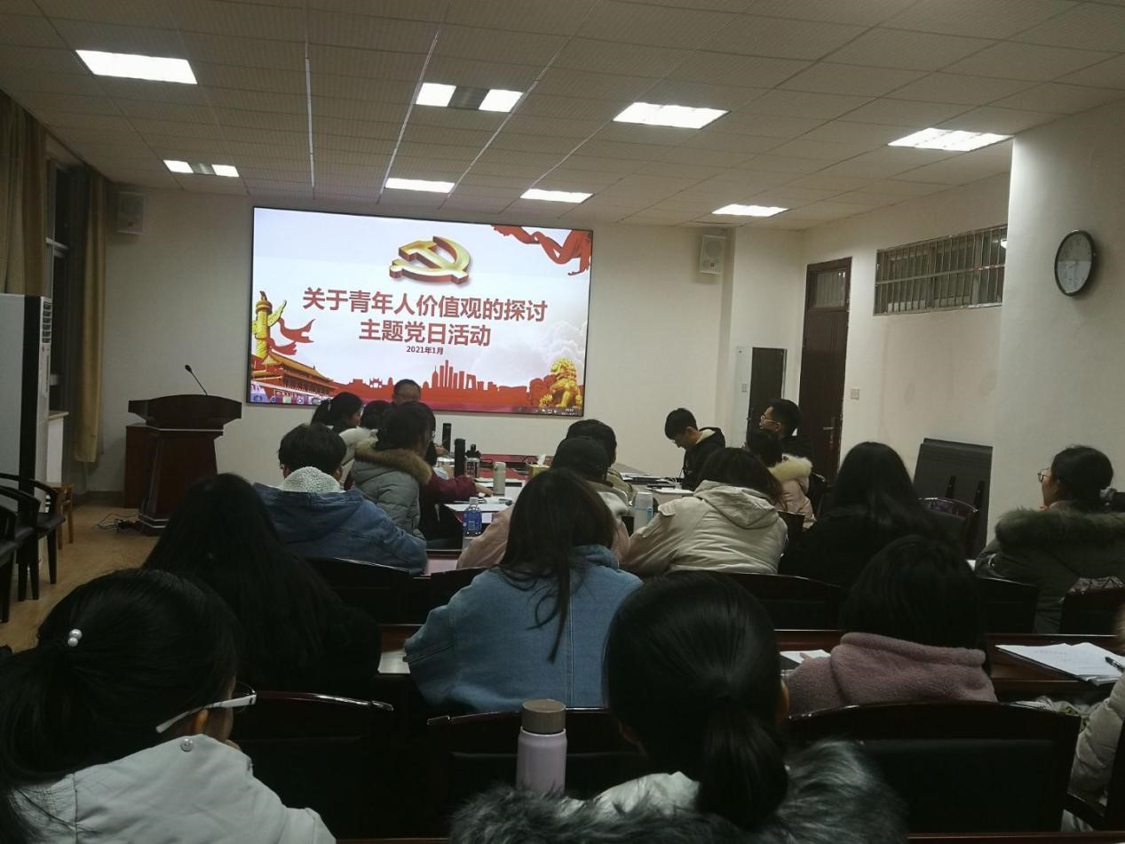 2021年1月11日晚,外国语学院本科生党支部在文科楼A603开展探讨青年人价值观主题党日活动,专职组织员汪功伟出席会议,外国语学院本科生党支部全体成员参加。