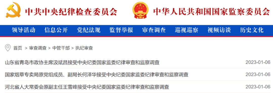 山东省青岛市政协主席汲某某,国家烟草专卖局原党组成员、副局长何某某,河北省人大常委会原副主任王某某接受中央纪委国家监委纪律审查和监察调查。