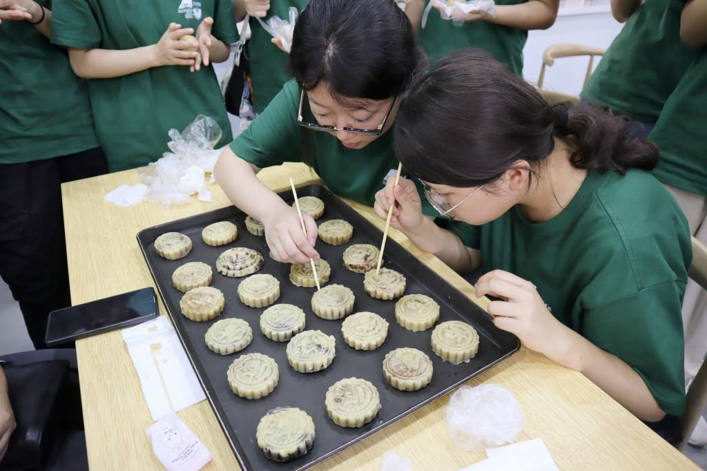 月饼制作环节,烘焙师现场演示了文创月饼的制作过程,包括选材、配比、造型设计等步骤。同学们充分发挥着自己的想象力,排队用模具印上花纹,每件作品都有着独特的意义,成品上印着的文化摆渡徽章,巧妙地将学院文化摆渡精神内涵和中秋节传统文化融为一体。活动最后,文丽丽书记对活动的成功开展给予了充分肯定,为全场与会人员送上了满满的节日祝福。本次活动在一张外院全家福大合照中圆满结束。