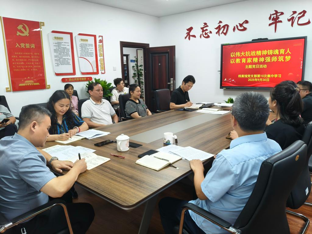 9月30日,档案馆党支部组织开展了“以伟大抗战精神铸魂育人,以教育家精神强师筑梦”主题党日活动(二)。会议由支部副书记王任飞主持,档案馆全体教职工参加。