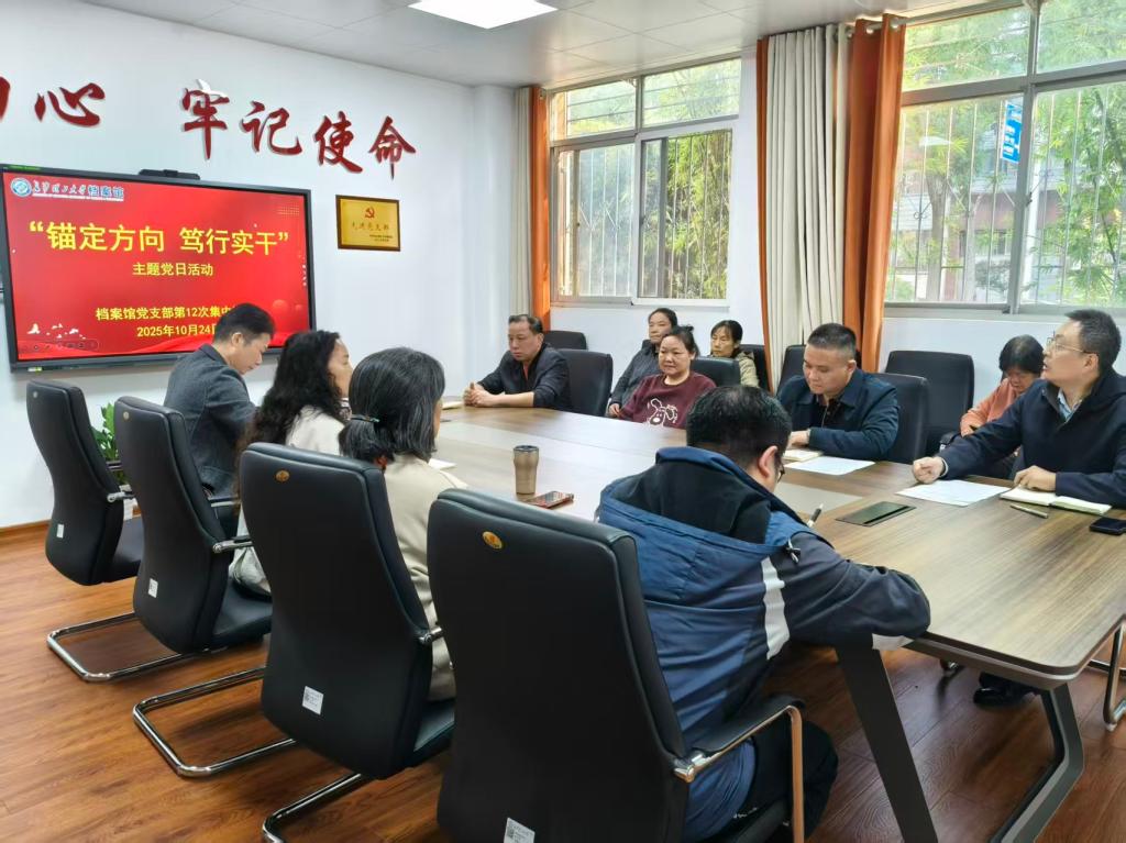 10月24日,档案馆党支部组织开展了“锚定方向 笃行实干”主题党日活动(二),会议由支部副书记王任飞主持,档案馆全体教职工参加。