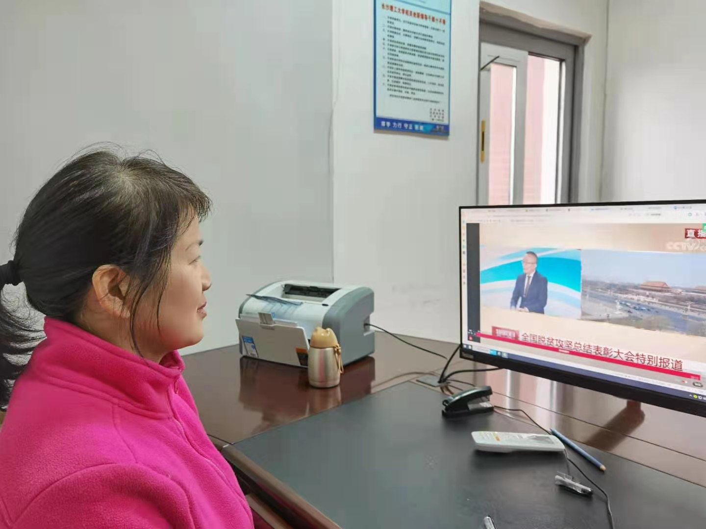 2月25日上午,全国脱贫攻坚总结表彰大会在人民大会堂隆重举行,中共中央总书记、国家主席、中央军委主席习近平向全国脱贫攻坚楷模荣誉称号获得者颁奖并发表重要讲话。大会还表彰了全国脱贫攻坚先进个人、先进集体。档案馆支部全体党员在金盆岭校区、云塘校区办公室及个别在家观看的方式,全程观看了大会直播。