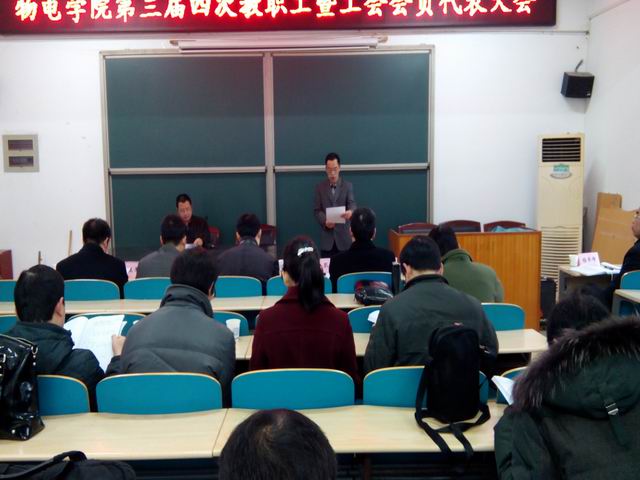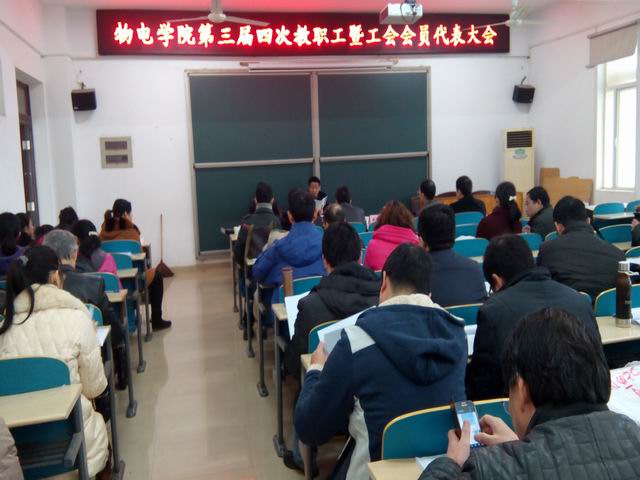 1月14日上午,物理与电子科学学院第三届四次教职工暨工会会员代表大会在院大会议室(理科楼B513)召开,全体代表及嘉宾共43人参加了此次大会,校工会常务副主席杨华峰教授出席并讲话。会议由院分工会主席孔凡志作大会筹备情况说明,院党委书记张可荣致开幕词,副院长陈曙光致闭幕词。