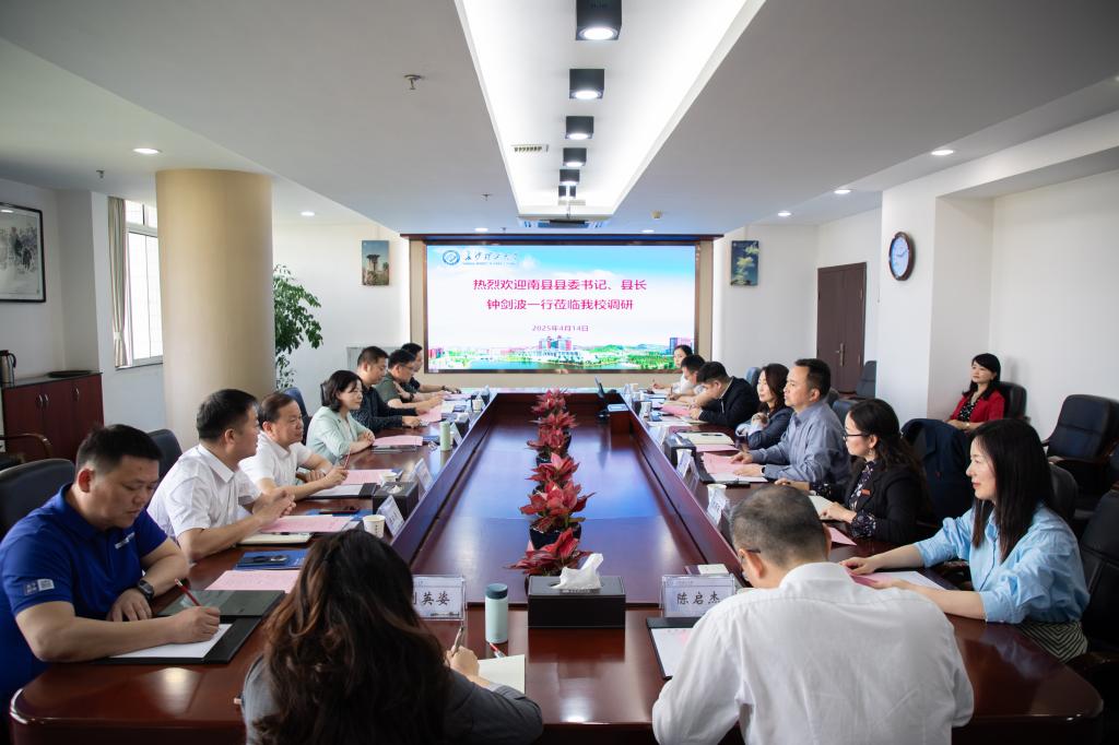 4月14日上午,南县县委书记、县长钟剑波率队来云顶国际vip8866调研。校党委副书记方琼出席座谈交流会。校党政办、创业就业指导处、工会、航空学院、食品学院、化学学院、设计艺术学院、校友中心相关负责人参加调研。