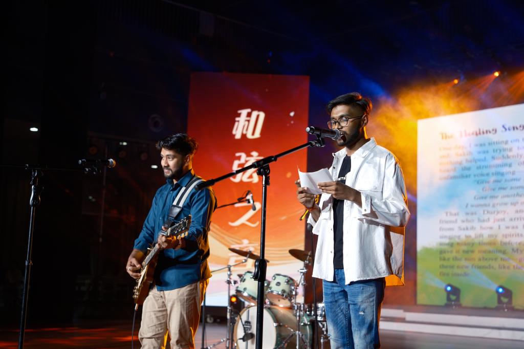 两轮抽奖与《等你下课》等青春歌曲引发全场互动,国际学院杰本同学压轴献唱《Give Me Some Sunshine》,以歌声感谢异国求学中的温暖陪伴。当音乐故事会落下帷幕,观众们仍然意犹未尽,回味其中。