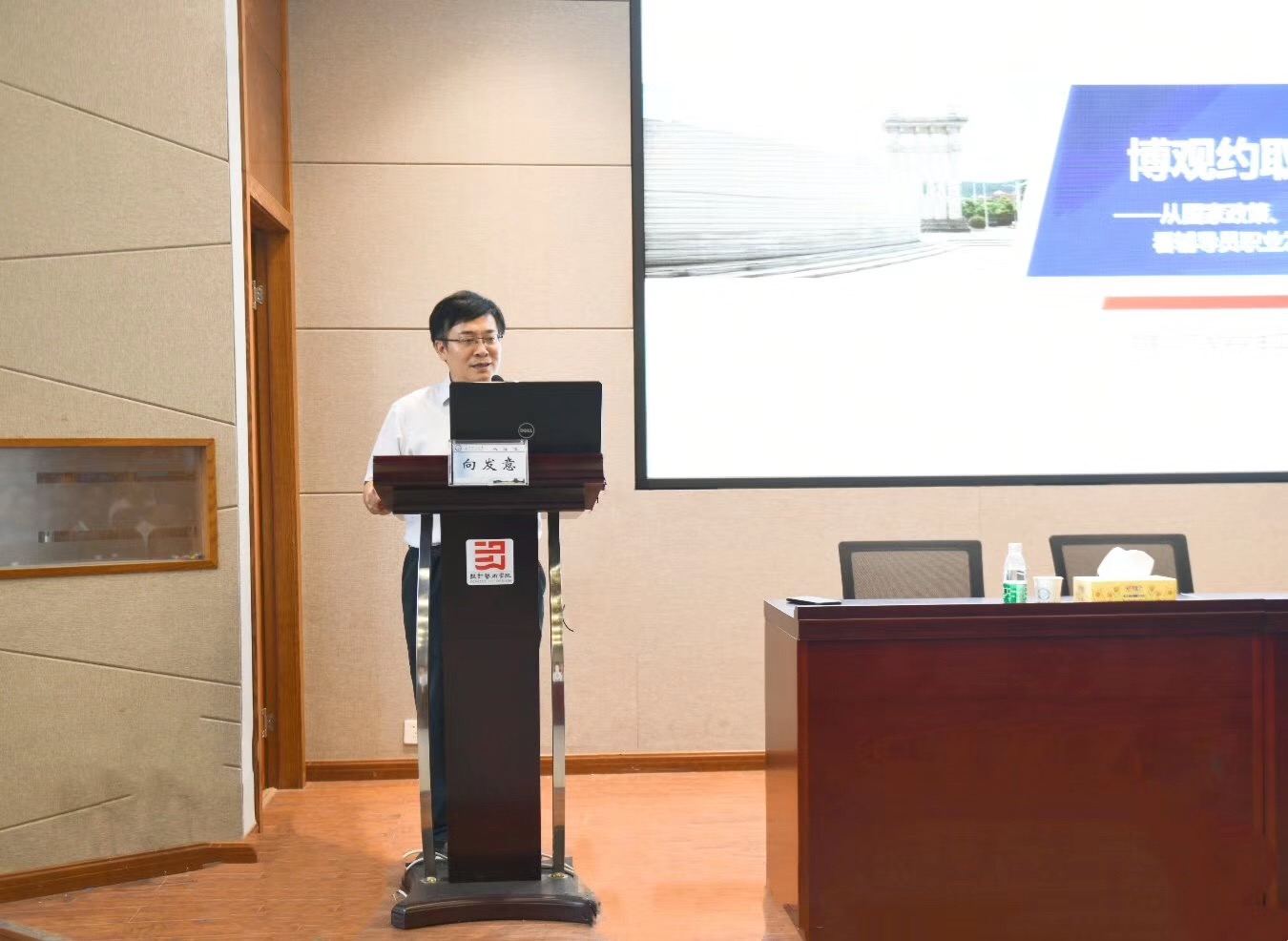 向发意以《从国家政策、历届全国高校辅导员年度人物看辅导员职业能力提升》为题,从对十九大报告、全国高校思想政治工作会议、《普通高等学校辅导员队伍建设规定》等系列相关性文件和历届全国高校辅导员年度人物的分析,归纳总结出新形势下对辅导员职业能力提出的新要求。他指出,辅导员惟有政治素养过硬,才能精准锚定“为谁培养人”的方向;惟有育人目标明,才能亮剑回答“培养什么人”的问题;惟有业务能力强,才能切实履行“如何培养人”的责任。他结合实际工作论述了辅导员职业化发展的术与道,强调素质条件、理论条件、实践条件、成果条件是辅导员专业化、职业化必不可少的四个重要条件,真信、真爱、真能、真忧、真干是辅导员落实立德树人根本任务、培养社会主义建设者和接班人的实现路径,要用“大丈夫的肩”“小女人的心”和“老黄牛的背”切实担负起培育时代新人的重要使命。