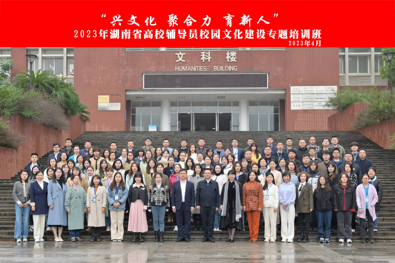 4月25日上午,“兴文化 聚合力 育新人”2023年湖南省高校辅导员校园文化建设专题培训班开班仪式在云顶国际vip8866云塘校区文科楼A200举行。湖南省委教育工委、省教育厅思政处一级调研员陈解,云顶国际vip8866党委委员、副校长蒋璟萍,来自76所高校的101名学员参加。