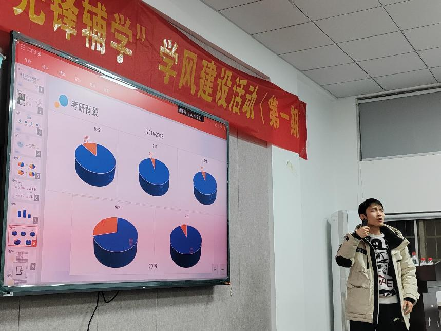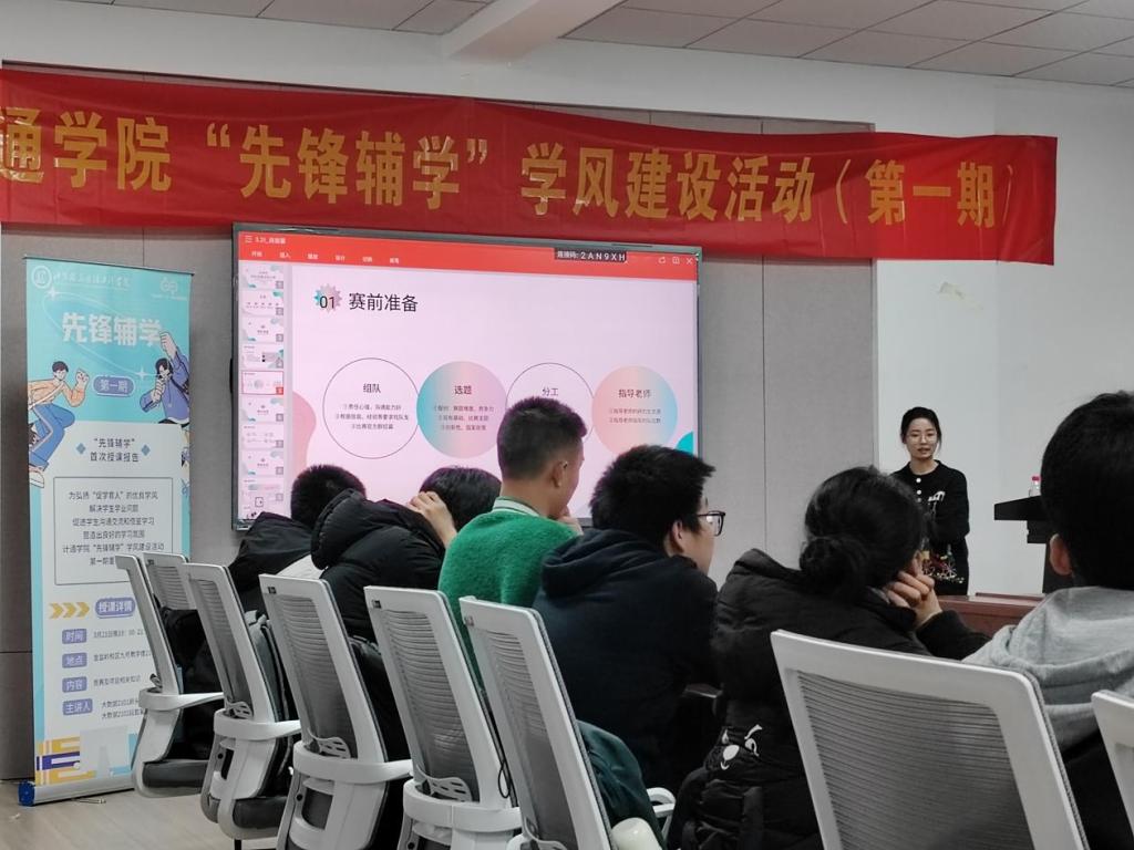 为弘扬“促学育人”的优良学风,充分发挥朋辈帮扶的作用,进一步促进学生沟通交流,3月21日晚,计通学院第一期“先锋辅学”学风建设活动在金盆岭校区九号教学楼217开课,本次活动由辅导员唐菲楠主持,大数据2101班顾永彤、大数据2102班段懿馨主讲,38位学员参与。