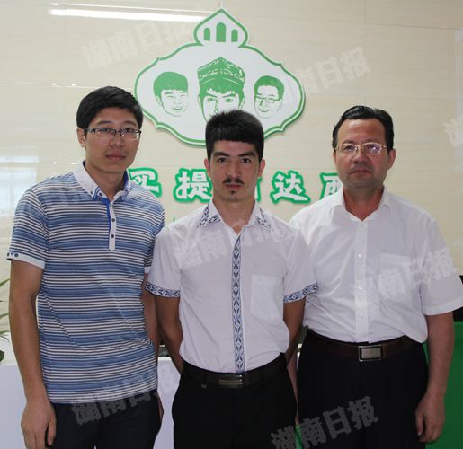 10月8日,湖南梦想起航电子商务有限公司,记者买买提·艾克木(右一)、记者李国斌(左一)与“切糕王子”阿迪力·买买提吐热(中)合影。通讯员 摄
