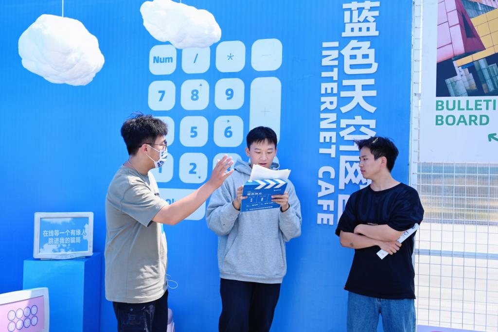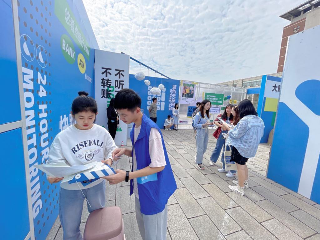 在学校图书馆东侧广场上,学生们排队体验近百坪的立方展示区。展示区由温馨365宿舍、悠着点银行、蓝色天空网吧、大明白图书馆等9个日常学生场景组成,同学们通过抽选剧本,进行角色扮演的方式,体验名为《诱人奶酪》《以爱为名》等多种主题的“剧本杀”。工作人员扮演角色(NPC)负责引导,让学生们逐步破解多个诈骗“套路”,从而增强自身的反诈意识。活动过程中,还有部分同学现场接受采访,通过讲述自己身边发生的诈骗经历,警示同学们提高警惕。