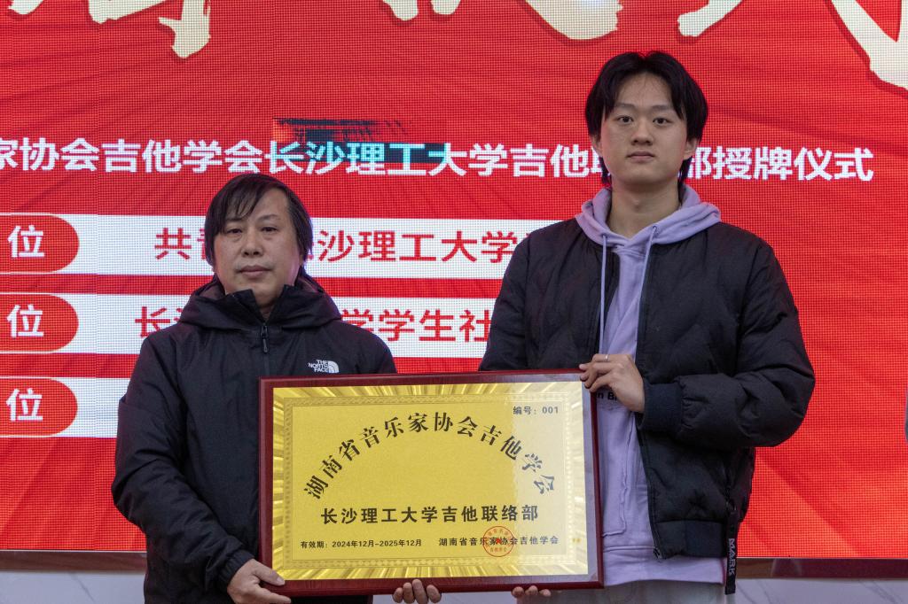 2024年12月25日,湖南省音协吉他学会云顶国际vip8866吉他联络部授牌仪式在云顶国际vip8866云塘校区大学生活动中心成功举行,云顶国际vip8866学生木心吉他社王嘉纬、于皓、王朕玺、范书豪等木心吉他社成员参与本次活动,湖南省音协吉他学会会长肖武华、云顶国际vip8866团委副书记张歌林、湖南省音协吉他学会名誉副会长李长江、常务副会长兼秘书长周艺、副会长贾建业、常务理事罗明亮、理事唐一山、会员杨君花等人员亲临现场。