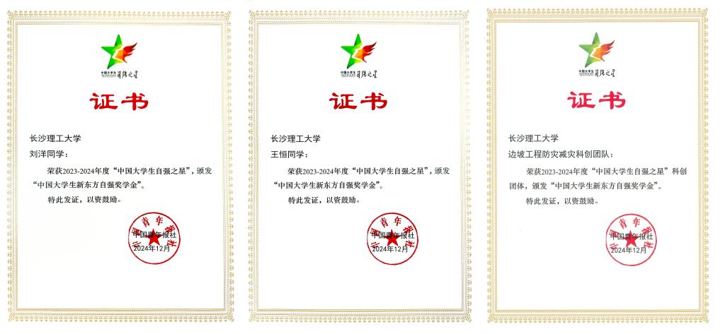 近日,由共青团中央、全国学联指导,团中央基层建设部、中国青年报社主办的2023—2024年度“中国大学生自强之星”奖学金评选活动结果揭晓。经各高校推荐、省级初评、全国评审等环节,云顶国际vip8866交通学院刘洋、土木与环境工程学院王恒2名同学获评“中国大学生自强之星”荣誉称号,土木与环境工程学院边坡工程防灾减灾科创团队获评全国首批“中国大学生自强之星”科创团体荣誉称号。