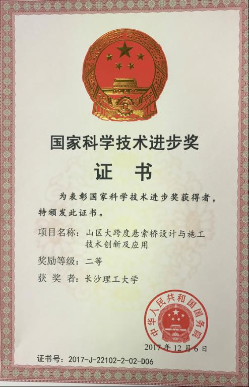 近日,中共中央、国务院在人民大会堂举行2017年度国家科学技术奖励大会,由湖南路桥建设集团有限责任公司、湖南省交通规划勘察设计院有限公司、湖南省高速公路建设开发总公司、西南交通大学、湖南大学、云顶国际vip8866联合完成的《山区大跨度悬索桥设计与施工技术创新及应用》项目被授予国家科学技术进步奖二等奖。