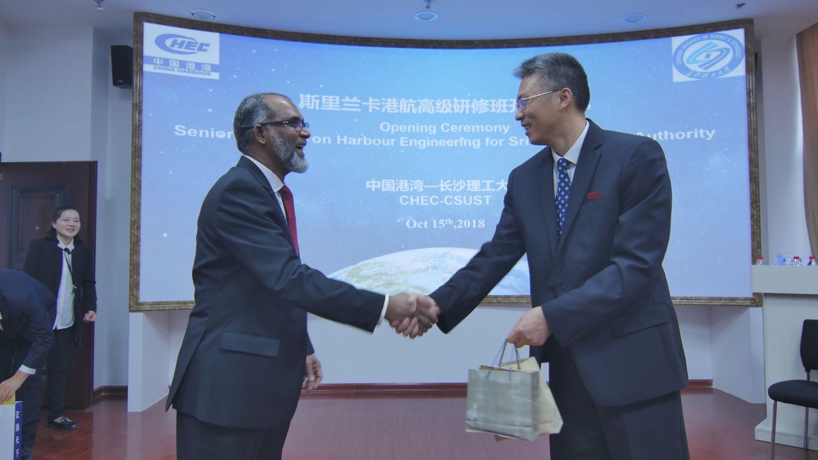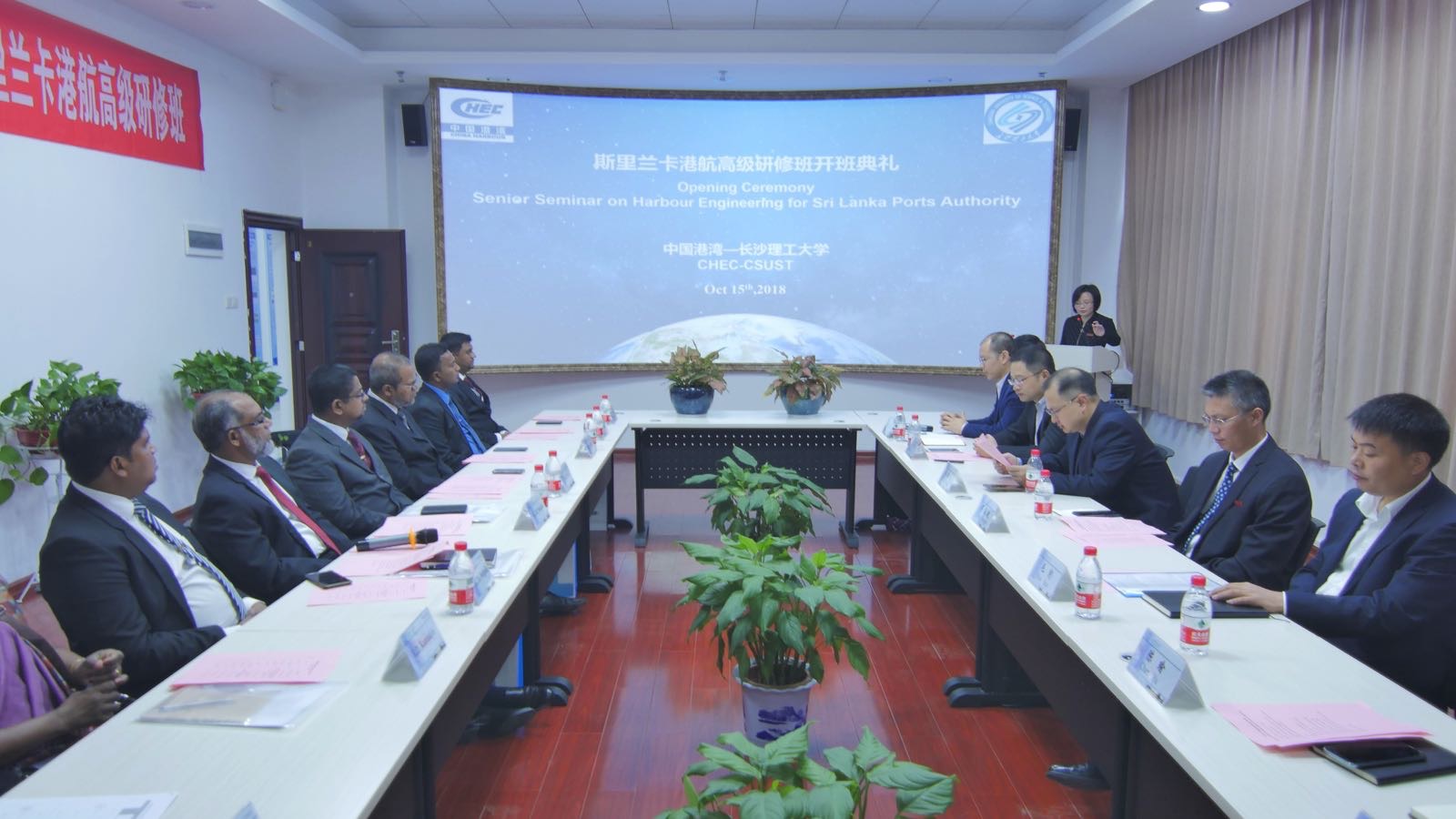 10月15日上午,斯里兰卡港航高级研修班开班典礼在洞庭湖环境保护与综合治理研究中心报告大厅顺利举行,来自斯里兰卡港务局的10名高级职员参加。副校长蒋昌波,中国港湾工程有限公司市场部经理毛豹,国际交流处处长吴迪龙、国际学院院长陈瑜、水利学院副院长陈杰、国际学院党总支副书记兼副院长吴振华、副院长甘海鹰等出席。开班典礼由国际学院副院长秦卫星主持。
