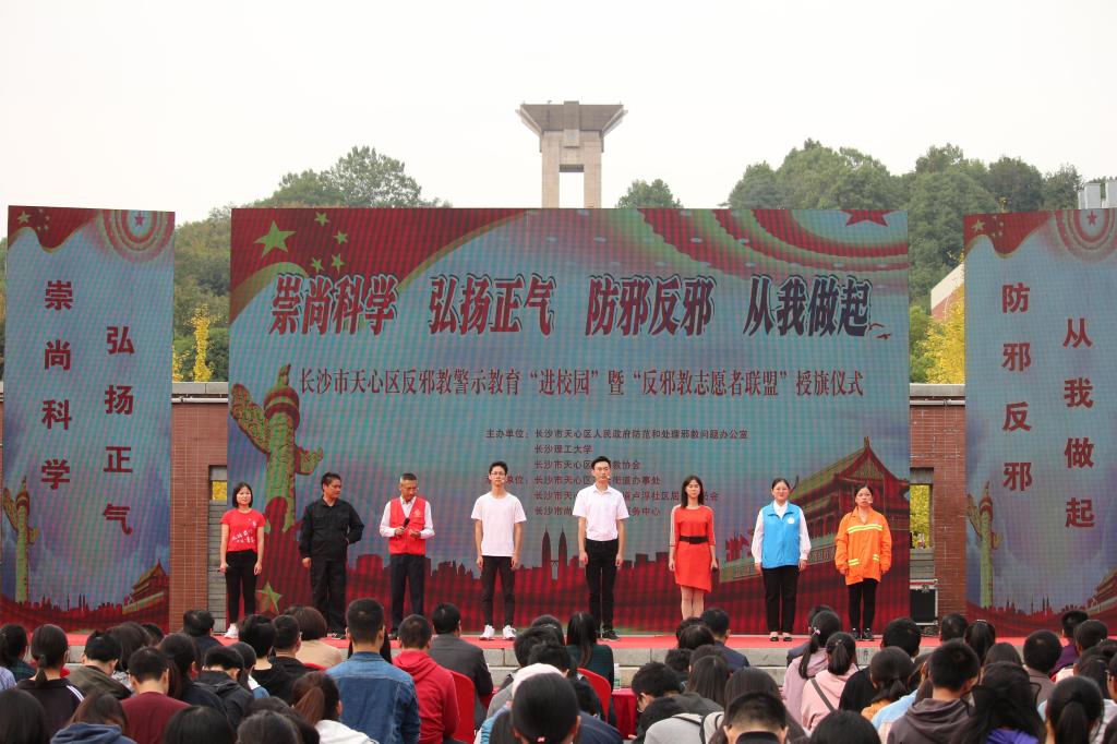 10月23日,天心区反邪教警示教育“进校园”暨“反邪教志愿者联盟”授旗仪式活动在云顶国际vip8866云塘校区文化广场举行。长沙市防范办、长沙市反邪教协会、天心区政法委、天心区防范办、天心区反邪教协会和天心区暮云街道的相关领导、部分师生、居民群众等近3000人参加了此次活动。校党委委员付嫦娥,校党委委员、宣传部部长方琼出席。