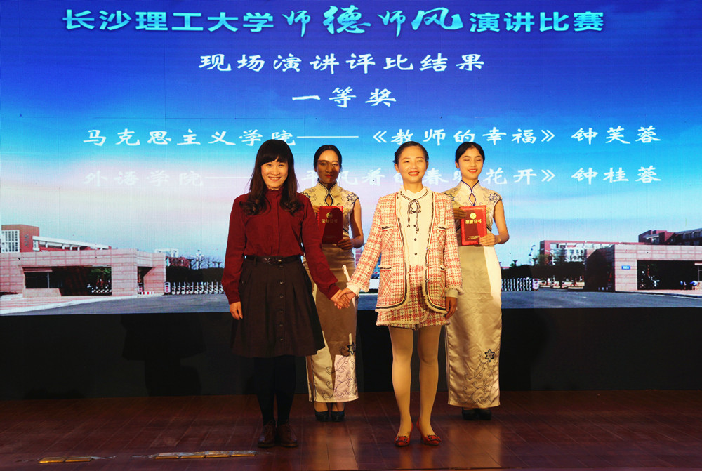 经过专家评审、大众评审环节的角逐后,后勤集团子校李慧老师获现场演讲特等奖,马克思主义学院钟芙蓉、外语学院钟桂蓉获得一等奖,国际学院黄文卫、物电学院郭剑、交通学院韩伟威获得二等奖,数统学院王跃恒、经管学院张帆帆、土木学院贺佐杰、机关万馨获三等奖,其余10位选手获得优秀奖。比赛还设立了演讲稿创作奖及现场人气选手奖。与会领导嘉宾为获奖选手颁奖。